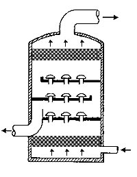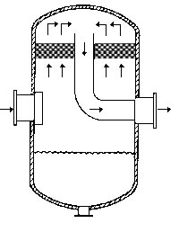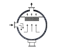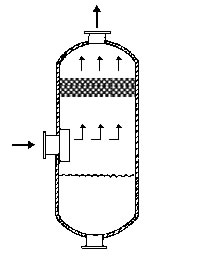 在通常的化工操作中所碰到的氣體中分散液滴的直徑約在0.1~5000μm。一般粒徑在100μm以上的顆粒因沉降速度較快,其分離問題很容易解決。通常直徑大于50μm的液滴,可用重力沉降法分離;5μm以上的液滴可用慣性碰撞及離心分離法;對于更小的細(xì)霧則要設(shè)法使其聚集形成較大顆粒,或用纖維過濾器及靜電除霧器。絲網(wǎng)除沫器,其主要用于分離直徑大于3μm~5μm的液滴,工作原理如右圖所示。當(dāng)帶有霧沫的氣體以一定的速度上升,通過架在格柵上的金屬絲網(wǎng)時,由于霧沫上升的慣性作用,使得霧沫與細(xì)絲碰撞而粘附在細(xì)絲的表面上。細(xì)絲表面上的霧沫進(jìn)一步擴(kuò)散及霧沫本身的重力沉降,使霧沫形成較大的液滴沿著細(xì)絲流至它的交織處。由于細(xì)絲的可濕性、液體的表面張力及細(xì)絲的毛細(xì)管作用,使得液滴越來越大,直至其自身的重力超過氣體上升的浮力和液體表面張力的合力時,就被分離而下落,流至容器的下游設(shè)備中。只要操作氣速等條件選擇得當(dāng),氣體通過絲網(wǎng)除沫器后,其除沫效率可達(dá)到97%以上,可以達(dá)到完全去除霧沫的目的。絲網(wǎng)除沫器(除霧器)用于分離塔中氣體夾帶的液滴,以保證有傳質(zhì)效率,降低有價值的物料損失和改善塔后壓縮機(jī)的操作,一般多在塔頂設(shè)置絲網(wǎng)除沫器�?捎行コ�3--5um的霧滴,塔盤間若設(shè)置除沫器,不僅可保證塔盤的傳質(zhì)效率,還可以減小板間距。所以絲網(wǎng)除沫器主要用于氣液分離。亦可為空氣過濾器用于氣體分離。此外,除沫器絲網(wǎng)還可作為儀表工業(yè)中各類儀表的緩沖器,以防止電波干擾的電子屏蔽器等。在化工工藝過程中,各種氣液相接觸設(shè)備的氣體離開設(shè)備時往往夾帶著不少液滴,如塔類設(shè)備、蒸發(fā)器等。一般要求把氣體中夾帶的液滴分離出來,以免影響氣體的品質(zhì)或下道工序的操作。從氣體分離液滴或霧沫的機(jī)理有重力下降、慣性碰撞、離心分離、布朗運動的擴(kuò)散沉積和靜電吸引。絲網(wǎng)除沫器是屬于慣性碰撞除沫中的典型產(chǎn)品,是一種高效的氣液分離設(shè)備。它具有除沫效率高、結(jié)構(gòu)簡單、空隙率大、壓力降小、重量輕,安裝、操作、維修方便等特點。當(dāng)氣體自下而上通過絲網(wǎng)除沫器時,由于慣性作用與絲網(wǎng)表面碰撞,霧沫隨即在細(xì)絲表面聚集而擴(kuò)張,不斷變大的液滴由于重量產(chǎn)生的重力超過氣速和液體表面的張力的合力時,液滴就下落。工業(yè)上常用于塔器、蒸發(fā)器和分離器等。